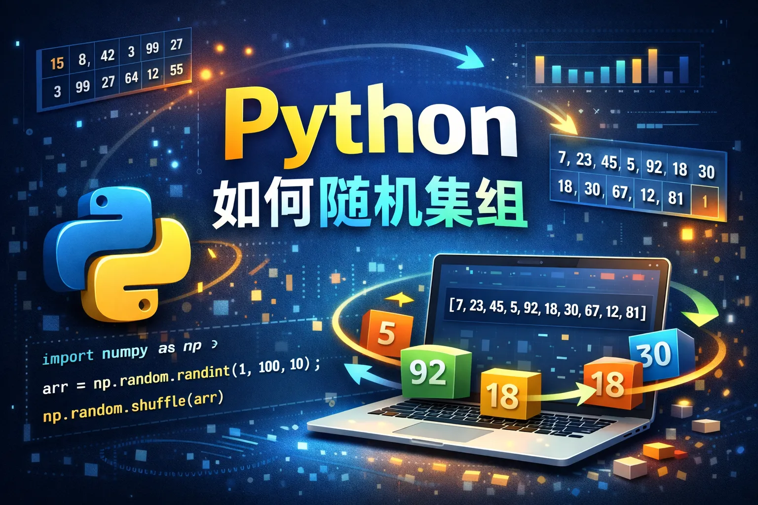 在NumPy中,生成随机浮点数数组时通过参数指定数组形状,例如numpy.random.rand(3,4)会生成3行4列的数组。对于整数数组,使用numpy.random.randint(low, high, size)函数,可以指定最小值low,最大值high(不包含high)和数组大小size。