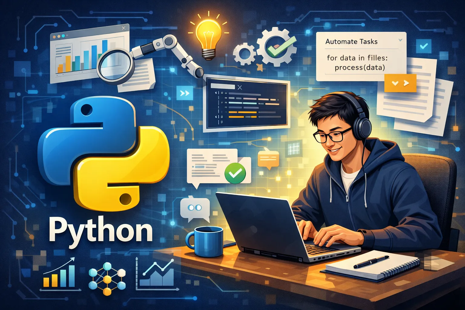 Python拥有简洁易读的语法和丰富的标准库,能够快速实现各种功能。此外,Python有大量第三方库支持,方便处理文件操作、图像处理、数据分析等任务,使得开发辅助工具变得高效且便捷。