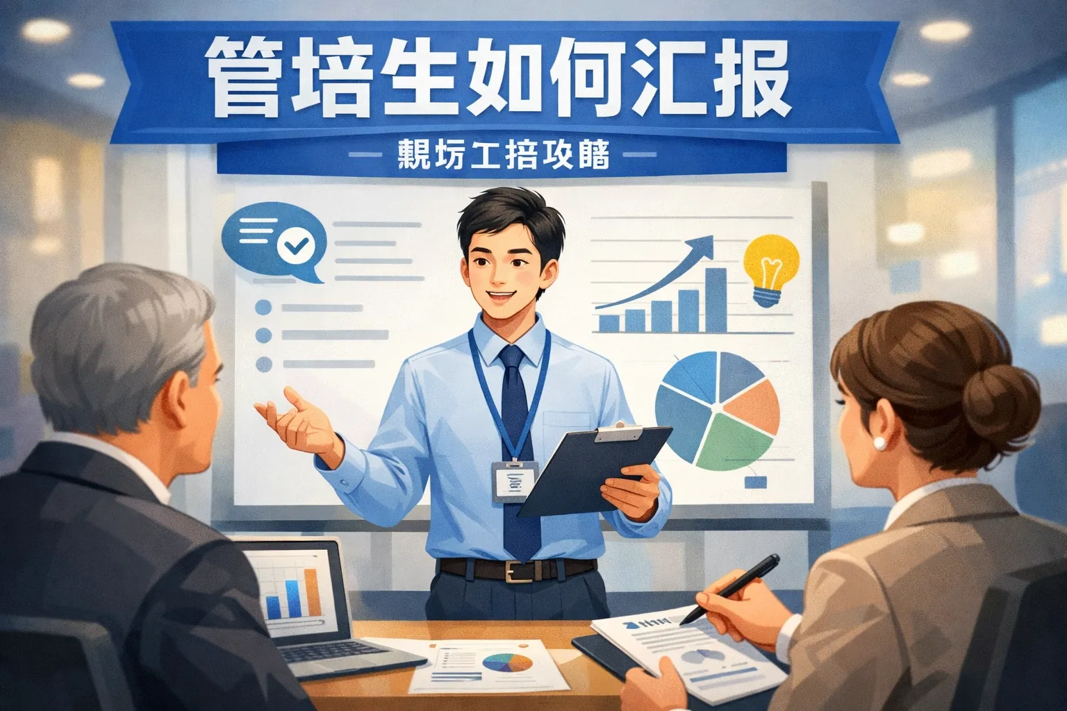 管培生在汇报时应聚焦于目标的达成情况、遇到的问题及解决方案,同时结合数据和事实支持观点。保持逻辑清晰,表达简洁,注重重点突出,避免冗长,让听众能够快速理解汇报内容。