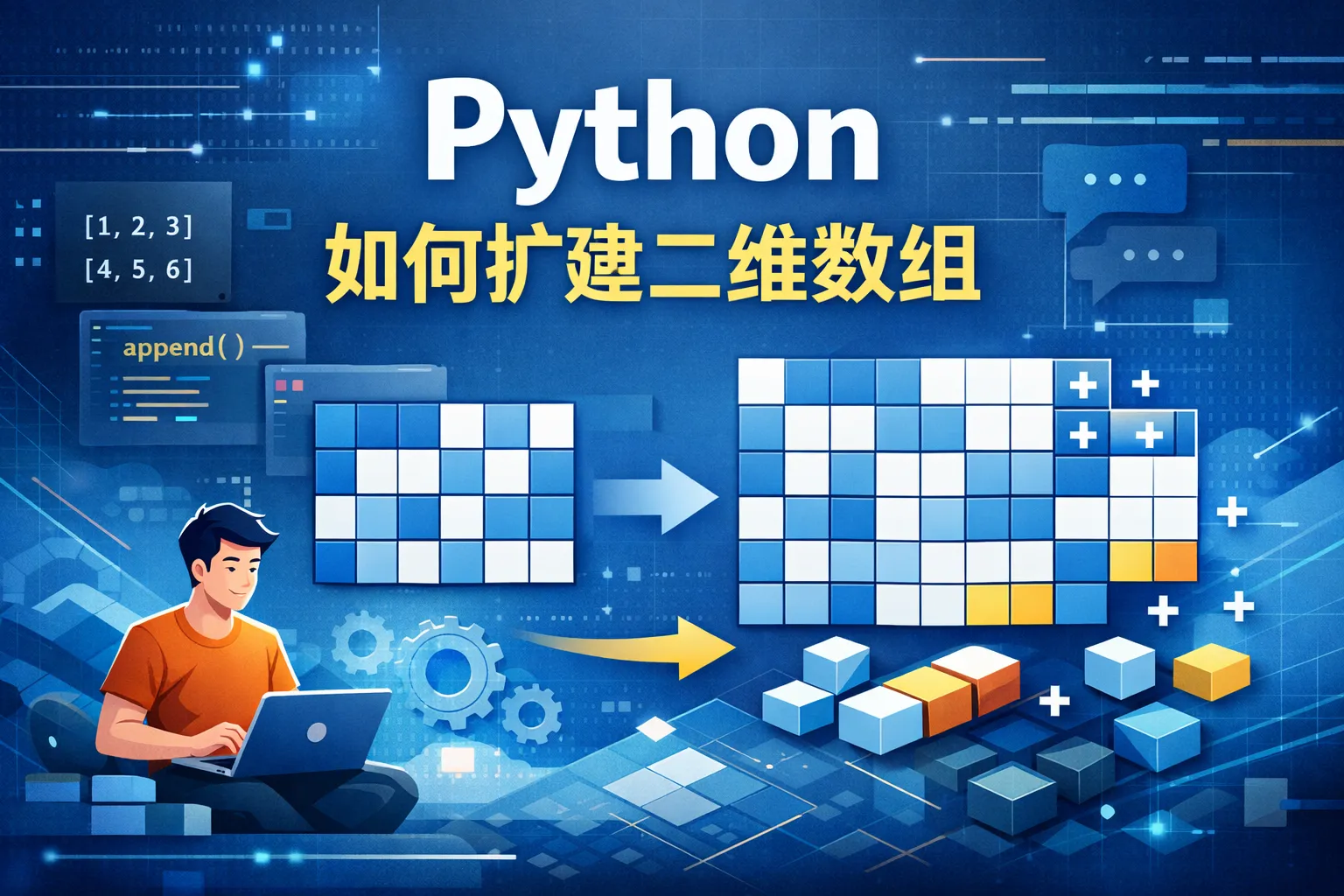 可以通过列表的append方法为二维数组添加新的行。对每一行使用extend方法可以增加列,但这种方式效率较低,建议仅用于简单需求。