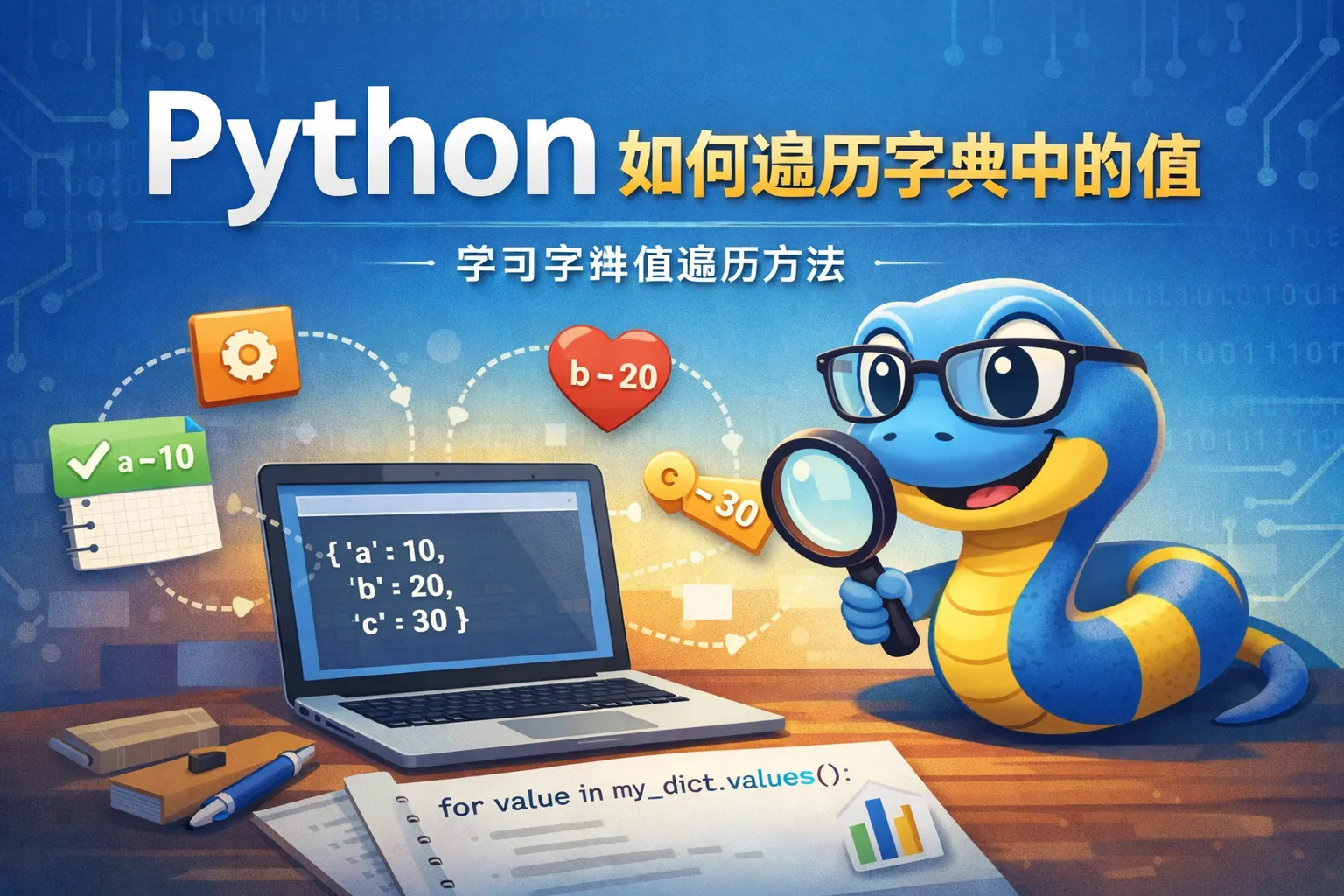 在Python中,可以通过字典的values()方法获取所有值,之后用for循环来遍历。例如: