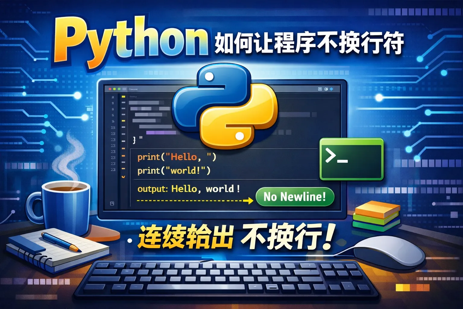 Python的print函数默认附加换行符,可以通过设置end参数来替换默认的换行符。例如:print('内容', end='')。这样输出内容后光标不会换行,方便实现连续输出效果。