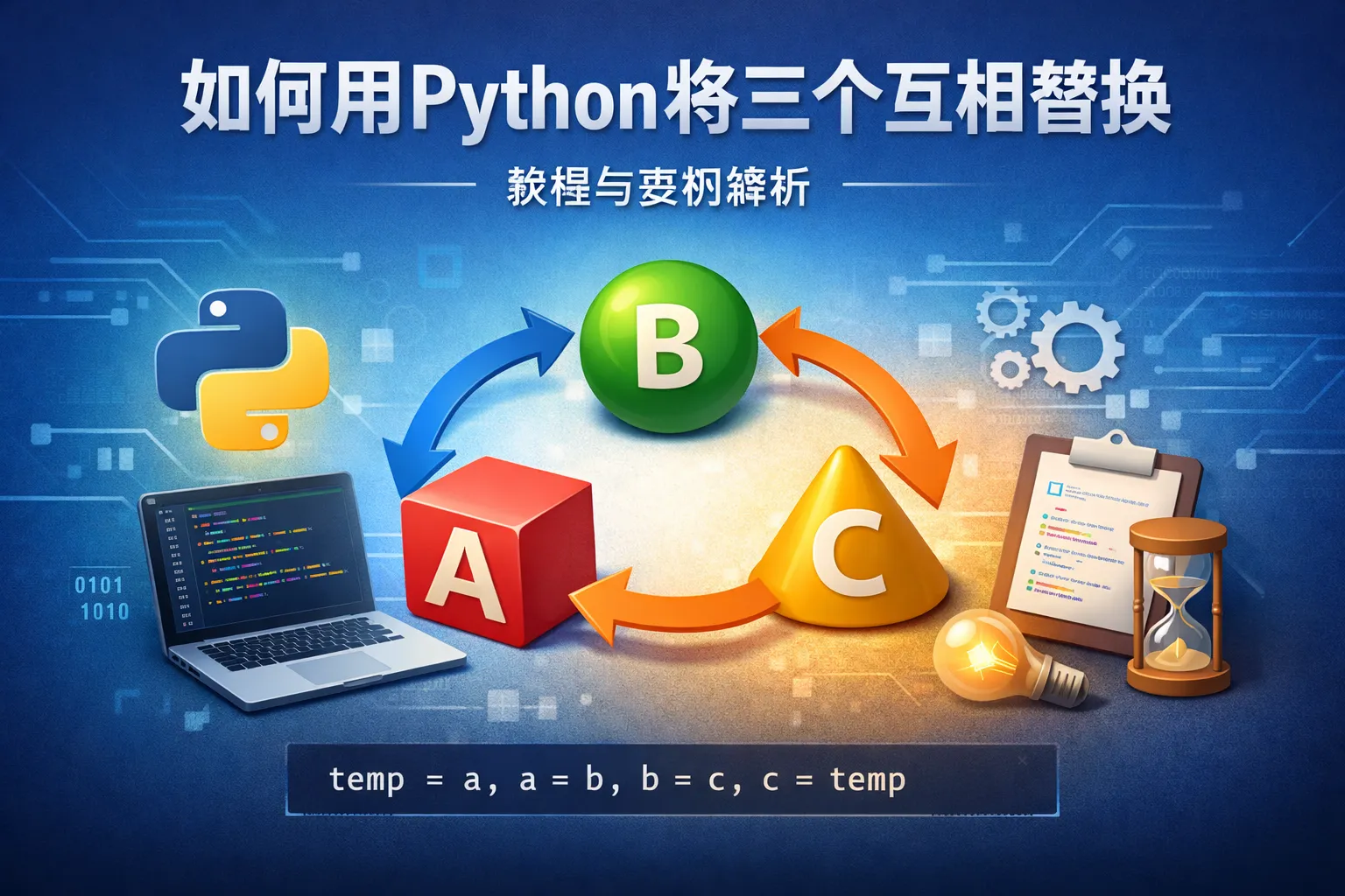Python的序列解包能够很方便地实现这一需求,表达式 a, b, c = b, c, a 就可以让a、b、c的值按循环顺序替换,写法简洁且逻辑清晰。
