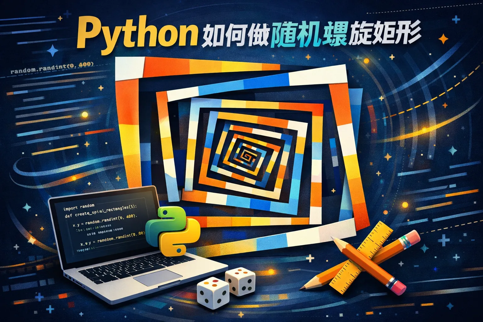 可以利用Python中的绘图库(如matplotlib或turtle),结合循环和几何变换实现螺旋排列。通过在每一步调整矩形的位置坐标,使其沿着螺旋路径变化。同时,加入随机数来调整矩形的大小和旋转角度,增加随机性和趣味性。具体步骤包括定义初始点和方向,在每次迭代中计算下一个矩形的位置,并使用随机函数改变其属性。
