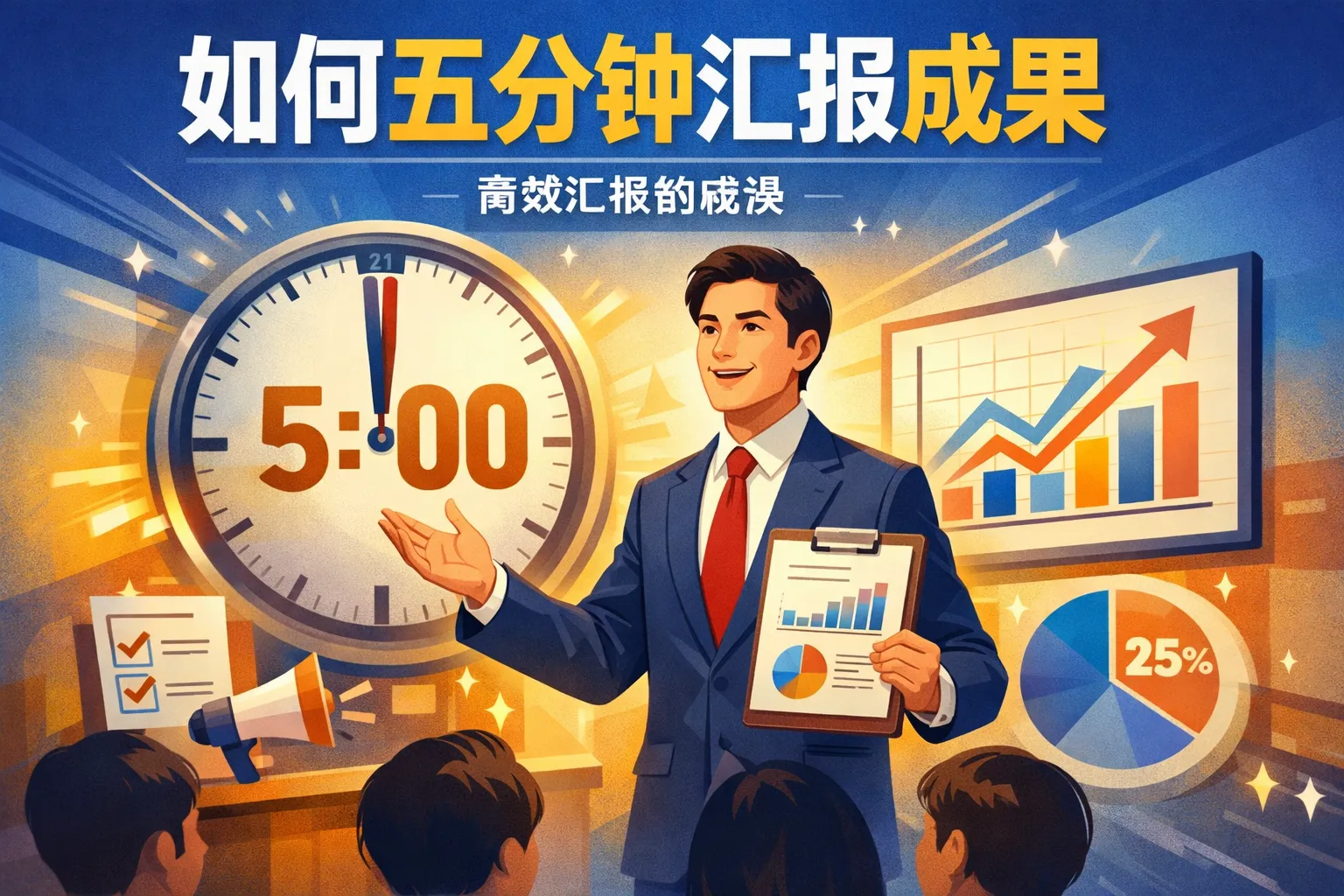在五分钟内汇报成果时,需提前准备,确定最重要的信息。不必详细阐述所有细节,选出最能体现价值和成效的数据或案例,突出成果的亮点。同时遵循逻辑清晰、层次分明的原则,配合简洁的视觉辅助工具,有助于听众快速把握核心内容。
