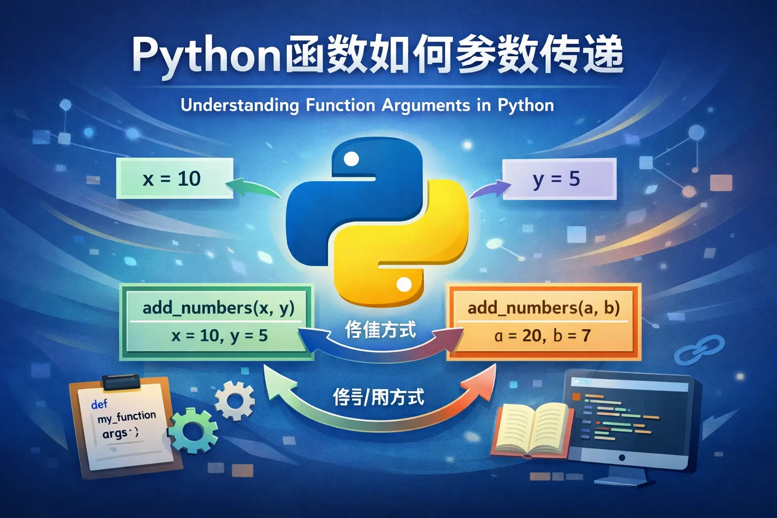 Python支持多种参数传递方式,包括位置参数、关键字参数、默认参数和可变参数。位置参数是最常用的传递方式,参数顺序要与函数定义一致。关键字参数允许你通过参数名传递,有助于代码的可读性。默认参数在函数定义时指定默认值,如果调用时不传则使用默认值。可变参数包括*args和**kwargs,分别用于传递任意数量的位置参数和关键字参数。